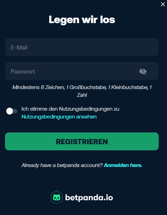 - Besuche die Betpanda Webseite: Rufe die Website von Betpanda auf und klicke auf den Button „Registrieren“ in der oberen rechten Ecke.