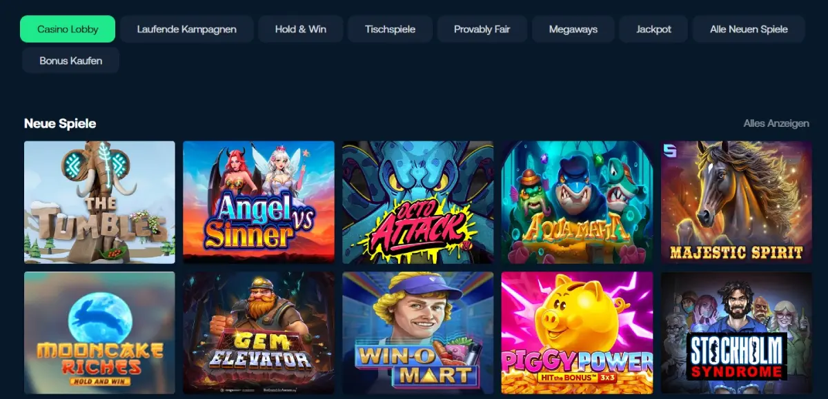 Die Spiele sind in mehrere Kategorien unterteilt, darunter Neue Spiele, Bonus Kaufen, Tischspiele, Megaways, Provably Fair und Jackpot.