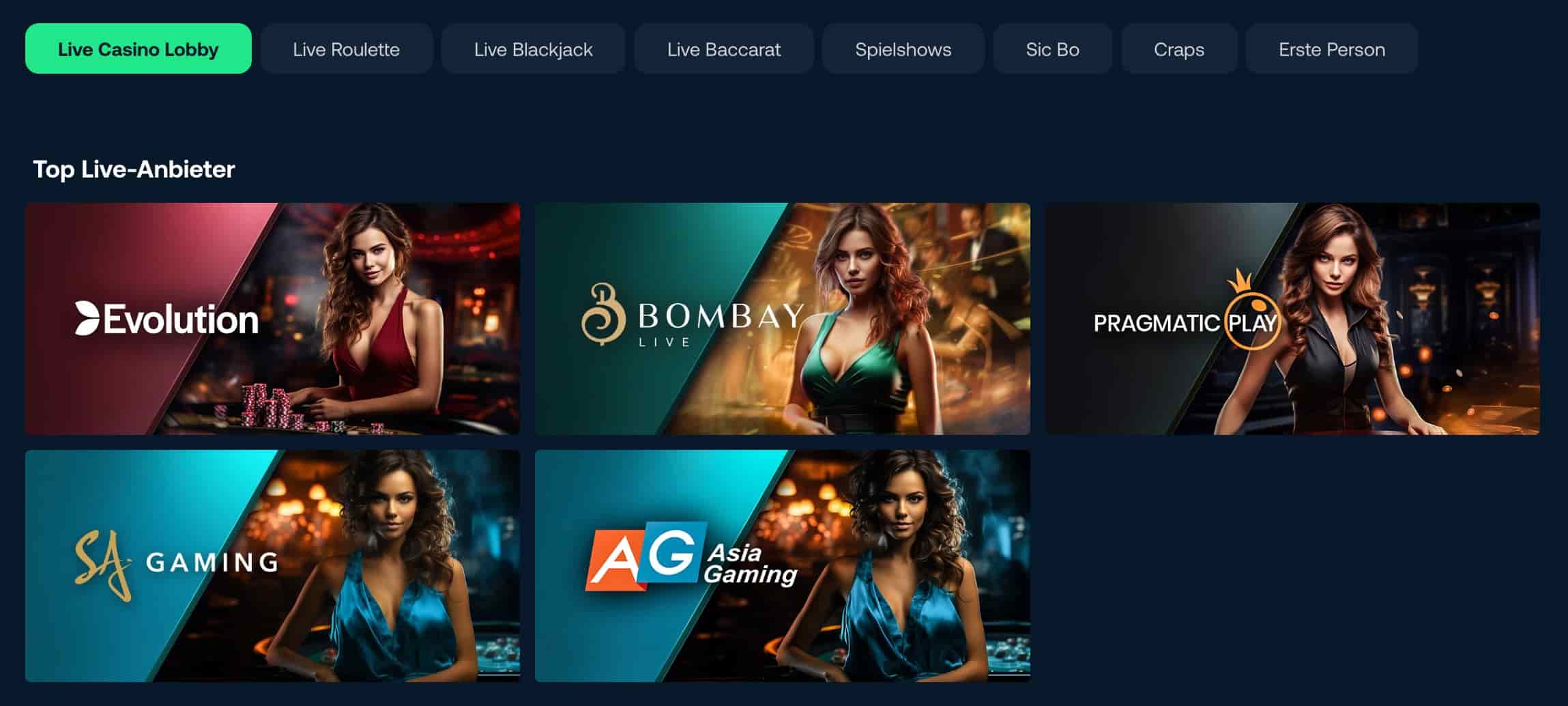 Das Live-Angebot wird durch unterhaltsame Game-Shows wie Crazy Coin Flip, Deal or No Deal, Cash or Crash und Crazy Time ergänzt.