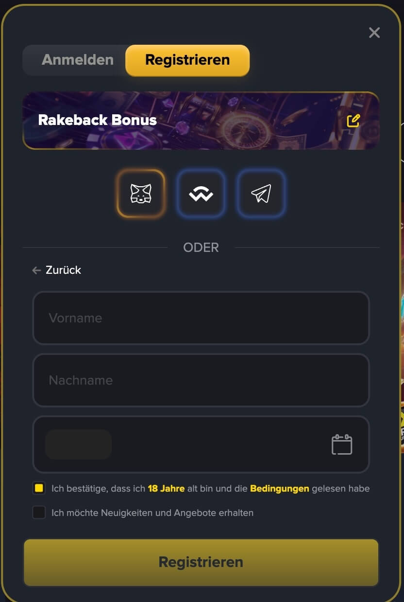 - Anmeldedaten eingeben: Trage Deine Vor- und Zunamen sowie Dein Geburtsdatum ein. Alternativ ist die Registrierung auch über MetaMask, WalletConnect und Telegram möglich.