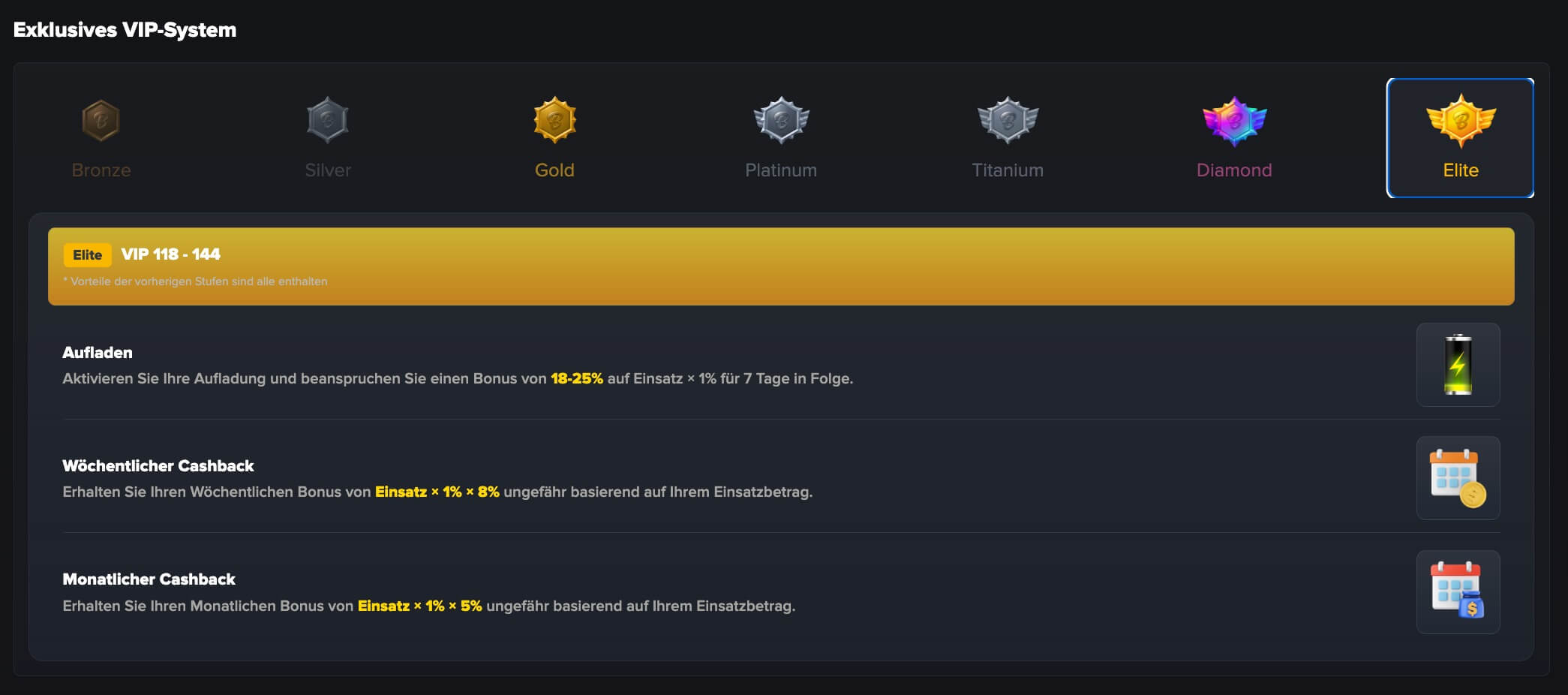 Zu den Vorteilen des VIP-Programms zählen wöchentliche und monatliche Cashback-Angebote sowie exklusive Boni. Je weiter Du aufsteigst, desto attraktiver werden die Belohnungen und Extras, die Dir zur Verfügung stehen.
