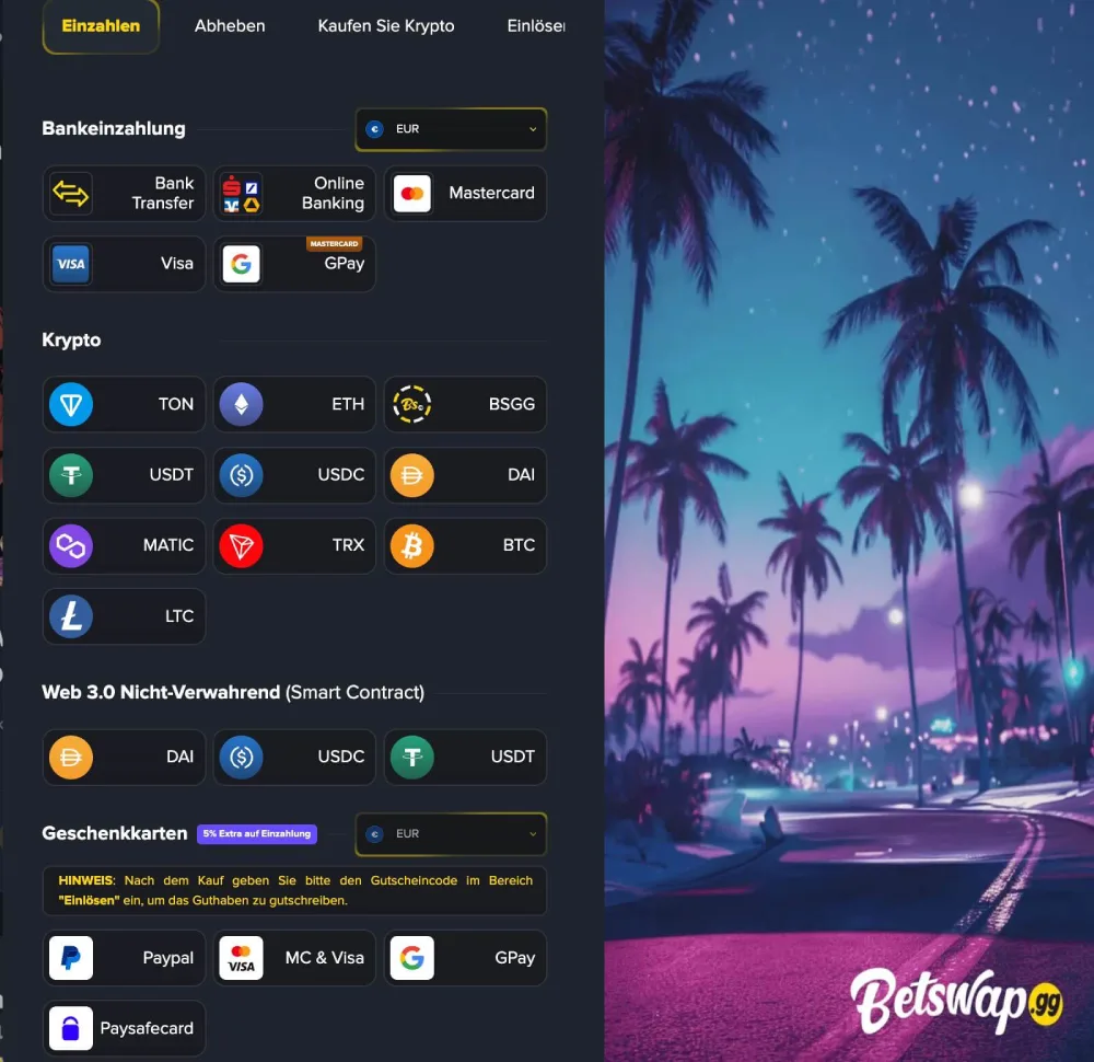 Im Betswap Casino stehen Dir sowohl Kryptowährungen als auch klassische Zahlungsmethoden wie Banküberweisung und Kreditkarte zur Verfügung. Ein Highlight ist der hauseigene Betswap Coin (BSSG), mit dem Du schnell und sicher Ein- und Auszahlungen durchführen kannst.
