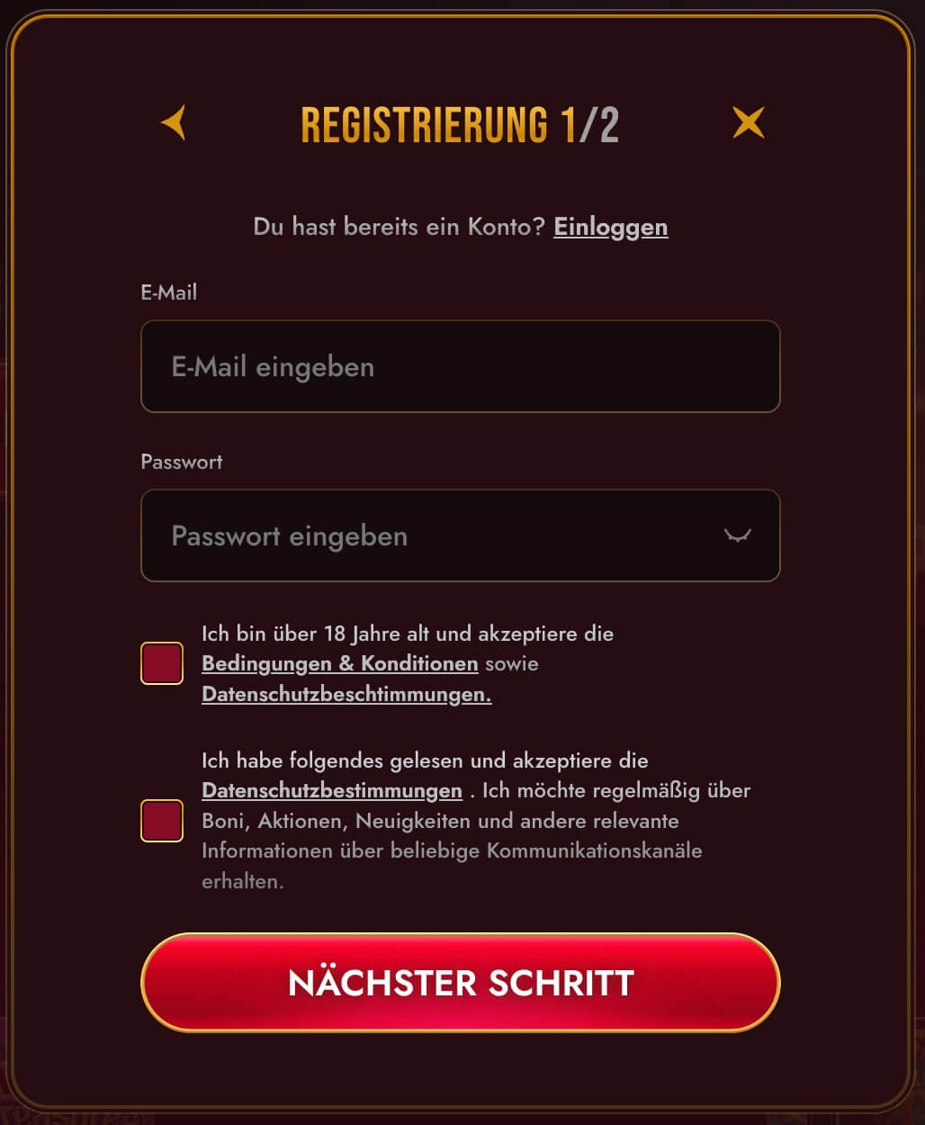 - E-Mail-Adresse und Passwort: Trage in die dafür vorgesehenen Felder Deine E-Mail-Adresse ein und vergib ein sicheres Passwort für Dein Grand Club Spielerkonto.