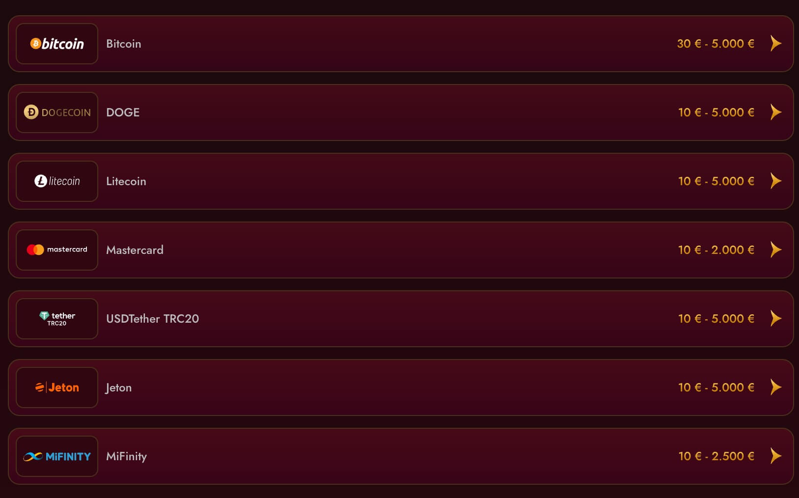 Grand Club bietet sowohl Fiat- als auch Kryptowährungen an. Mit 4 Coins ist die Auswahl an Kryptos überschaubar und es stehen nur die gängigsten Optionen zur Verfügung. Als ich meinen Test durchführte, waren die nachfolgenden Zahlungsarten verfügbar: