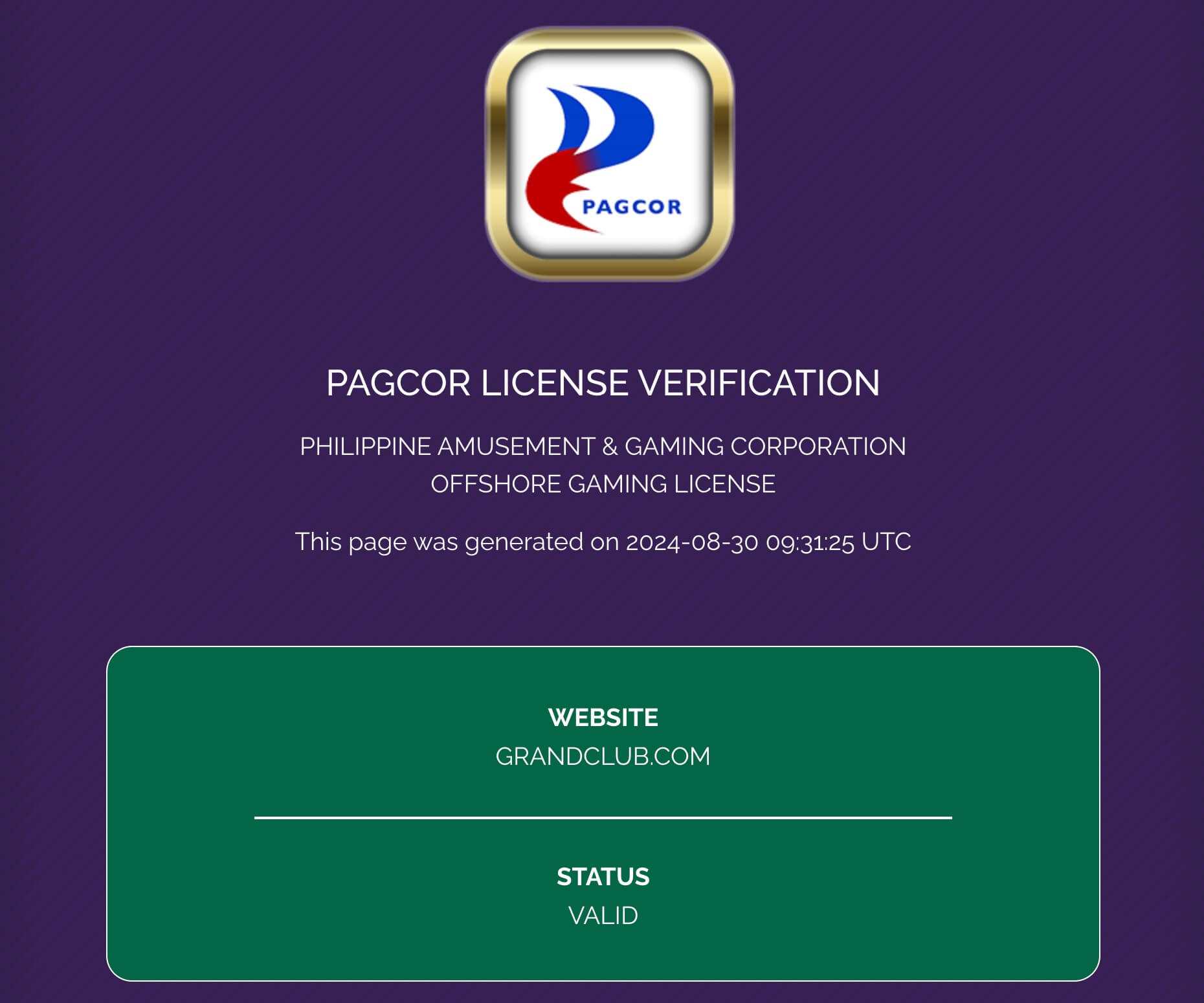 Das Grand Club Casino wurde von der Philippine Amusement & Gaming Corporation lizenziert und besitzt eine gültige Offshore Gaming License für Online-Casinospiele und Sportwetten.
