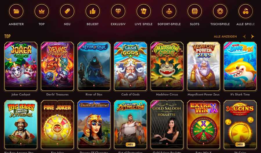 Das Spielangebot enthält die Kategorien Slots, Tischspiele, Sofort-Spiele und Live-Spiele. Zusätzlich kannst Du die Spielauswahl nach Anbietern sowie beliebten, neuen, exklusiven und Top-Spielen filtern.