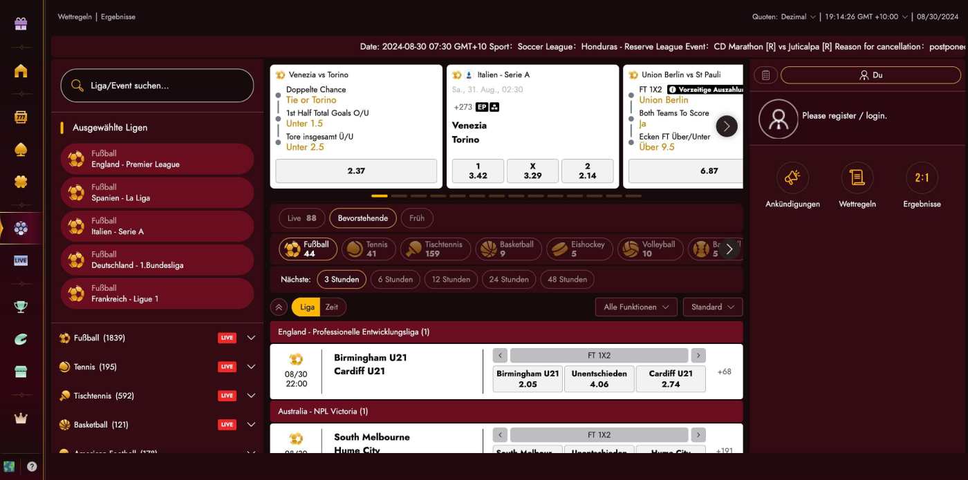 Sport-Fans kommen im Sportwetten-Bereich von Grand Club auf ihre Kosten. Hier findest Du populäre Disziplinen wie Fußball, Tennis, Tischtennis, Basketball, American Football, Eishockey und Volleyball, aber auch E-Sports-Wettbewerbe und Events aus der Politik. Abgeben kannst Du sowohl Pre-Match- als auch Live-Wetten.
