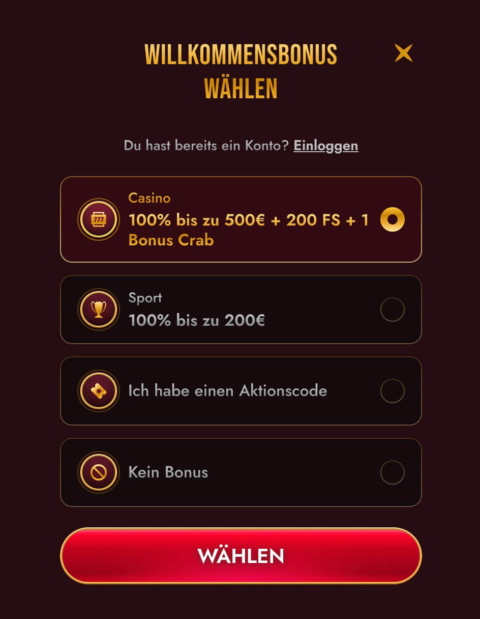 - Willkommensbonus wählen: Entscheide Dich für einen der vorgeschlagenen Boni oder gib einen Aktionscode ein, falls Du einen vorliegen hast.